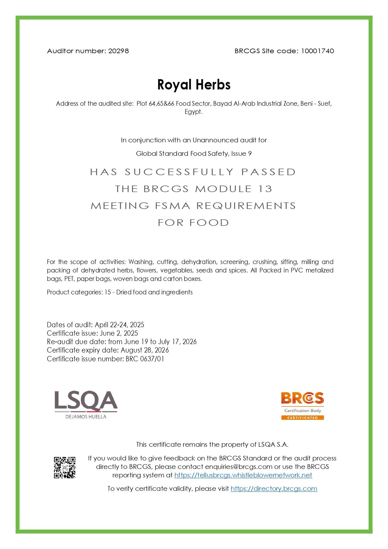 Certified to meet the rigorous global standards (FSMA Requirements) for food safety, quality, and operational excellence. This certification assures that products are produced under strict safety protocols, providing consumers with confidence and trust in every item.